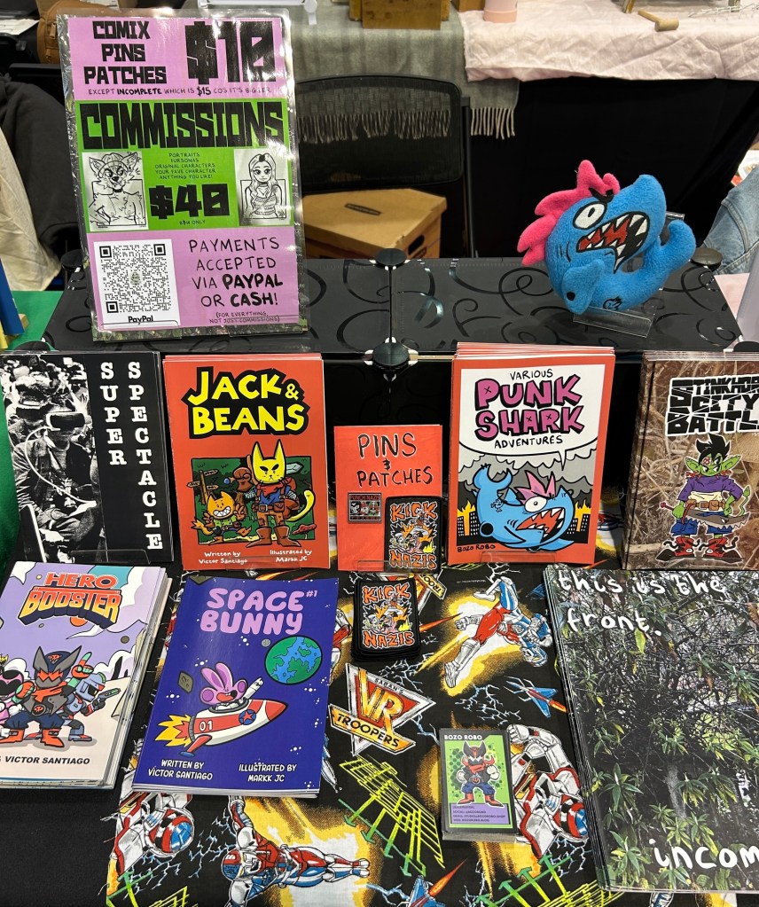 That included; Some stuff for displaying books, 5 different comics (15 copies of each except for Punk Shark which I bought 30 of) a few sew on patches, some pins and some stuff to draw commissions with should the opportunity arise. Oh, and a Punk Shark plush that I got made about 3 years ago and have only now started displaying on my table.