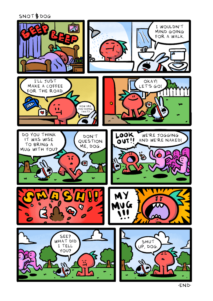 The first comic is a redrew of my original outcome during the workshop. The second one is hot off the press. I don’t really know where I’m doing with Snot & Dog but I wanna keep going with it. I enjoy writing extremely silly, single page comics.