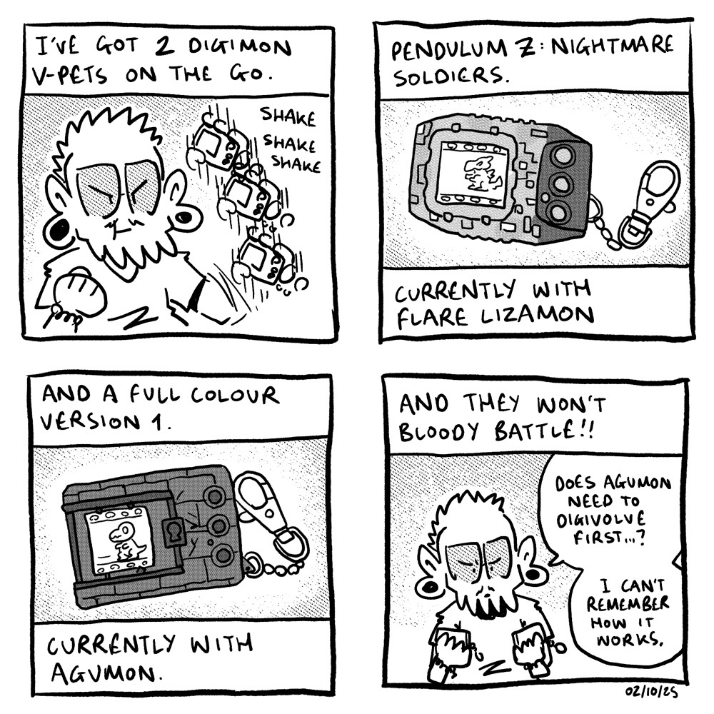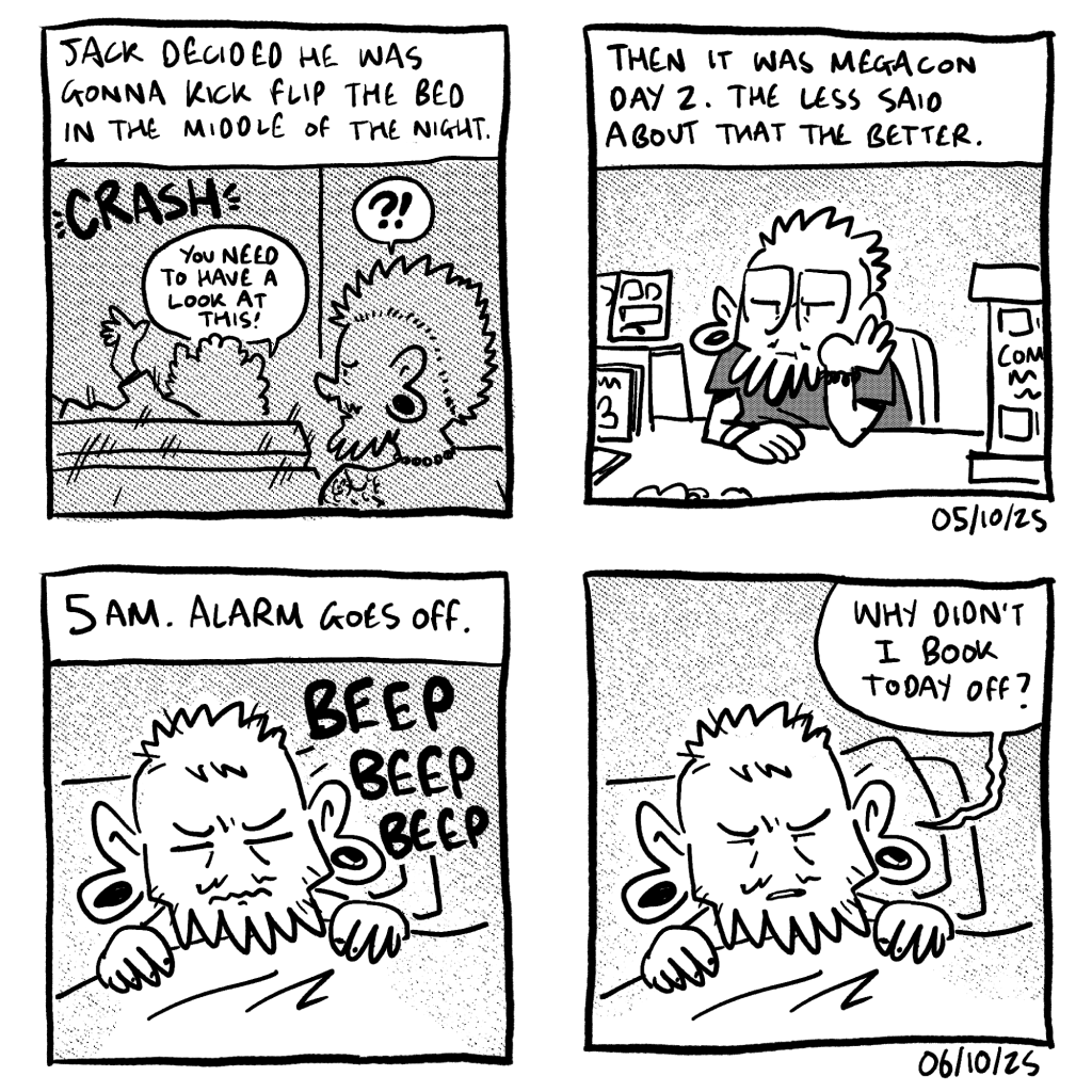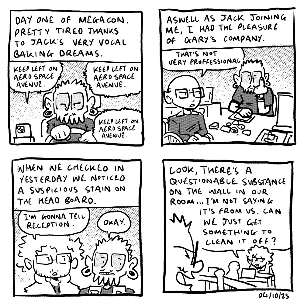 I keep making the same mistake whenever I decide to make daily comics in October. I quickly realise that a lot of stuff happens at work. I can’t talk about work. So there are days on end that can’t have dairy comics written about them.